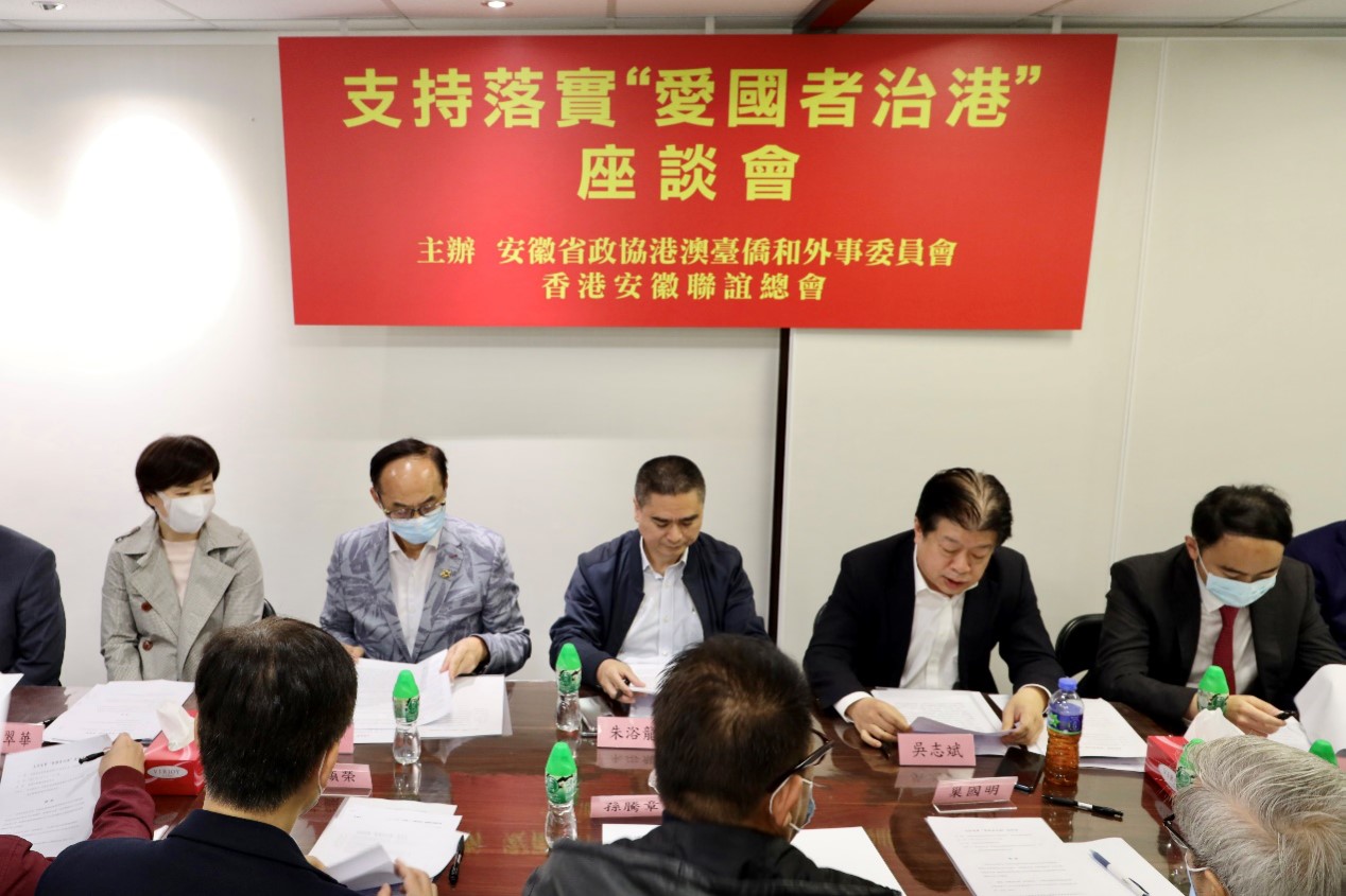 3月5日下午,由安徽省政协港澳台侨和外事委员会、香港安徽联谊总会联合主办的支持落实“爱国者治港”座谈会在联谊总会会址召开。座谈会上,安徽省政协常委、香港安徽联谊总会常务副会长朱浴龙强调,“爱国者治港”的目的就是为了让“一国两制”能够健康地、成功地实践,令“一国两制”行稳致远。(记者 金东 周伟琪 冯良辰 李志强 苏子杰 叶丽丽)