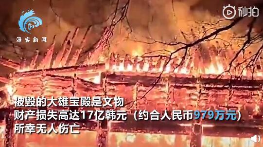 被毁的大雄宝殿是文物,财产损失高达17亿韩元(约合人民币979万元)所幸无人伤亡。