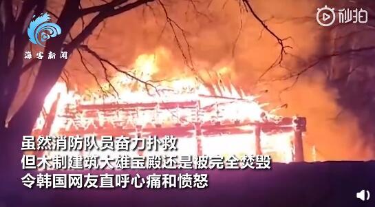 虽然消防队员奋力扑救,但木制建筑大雄宝殿还是被完全焚毁,令韩国网友直呼心痛和愤怒。