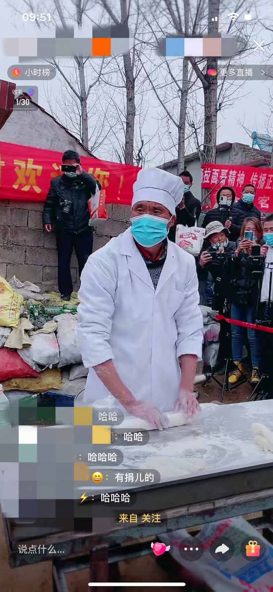 记者从3月6日的直播中看到,“拉面哥”的面摊已经转移到家门口。程运付在中间做拉面,四周是求关注求送礼物的主播们。有人靠直播“拉面哥”就能吸引五千多人观看,人气冲到山东榜第五名。做拉面的间隙,程运付偶尔拿着话筒,提醒大家注意安全,感谢大家的支持。
