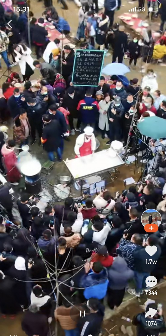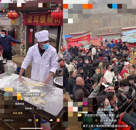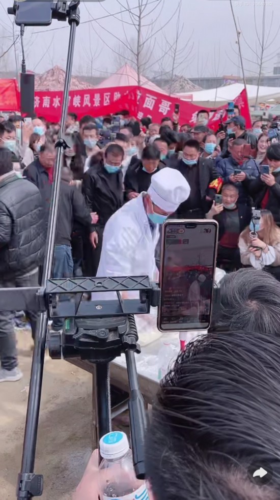 记者从一些自媒体博主拍的短视频和直播看到,“拉面哥”赶集出摊时,他的面摊被人群团团围住,几乎人手一个支架和手机。还有人跑五百多公里到山东临沂,为吃碗拉面排队半个多小时。为了蹭上热度,有人说要去找拉面哥求婚,有人在直播中朝着做拉面的程运付喊“干爹,我爱你”。