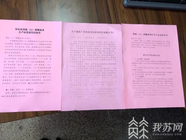 现场还向企业负责人发放了《洞庭(山)碧螺春茶叶生产企业指导书》、《预包装洞庭(山)碧螺春茶生产标签规范的指导》、《关于强化广告宣传导向审查的行政提示书》,详细列举了茶叶生产企业所需注意的关键要点,并且针对包装、广告、网络交易、标签标识中经常出现的问题进行了现场指导,规范其生产、经营等行为。