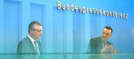 △德国联邦卫生部长施潘(右)和罗伯特·科赫研究所所长威勒5日在记者会上(图片来源于网络)