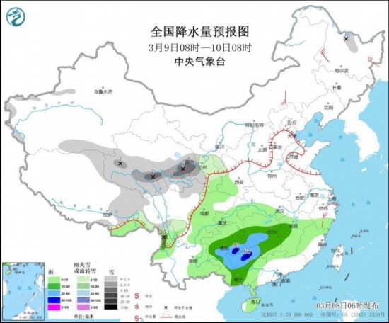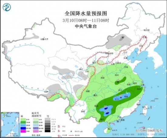 3月10日8时至11日8时,西藏东部、青海中部、西北地区东北部、内蒙古中部、川西高原等地部分地区有小到中雪或雨夹雪。西北地区东南部、华北南部、黄淮西部、西南地区东部、江汉、江淮、江南、华南北部和中西部等地部分地区有小到中雨,其中,广西东北部、湖南东部、江西中部等地部分地区有大雨,局地暴雨(50~70毫米)。