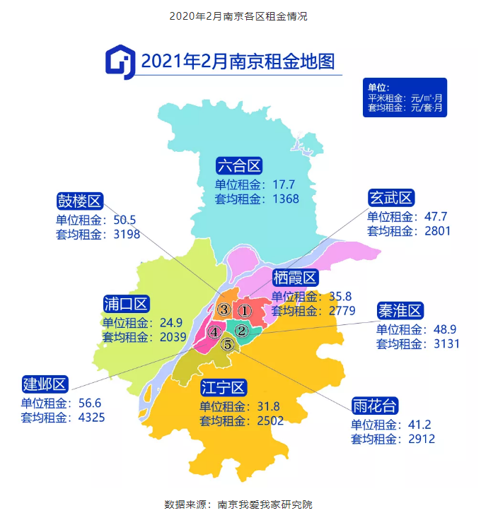 根据我爱我家南京研究院的统计,虽然南京的租赁市场启动较早,不过租金却没有变化,2021年2月份南京全市的平均租金为40.3元/㎡,环比1月持平,同比则上涨了5.5%。从平均租金来看,鼓楼、玄武、栖霞、雨花台等区的租金有所上涨,其他区域则呈下滑态势;从套均租金来看,鼓楼套均3198元、秦淮套均3131元、玄武套均2801元继续上涨,建邺的套均租金为4325元出现下降趋势,此外,江宁、浦口、六合等地的套均租金也出现不成程度地下降。