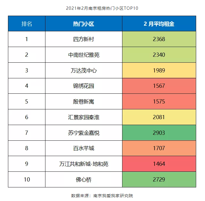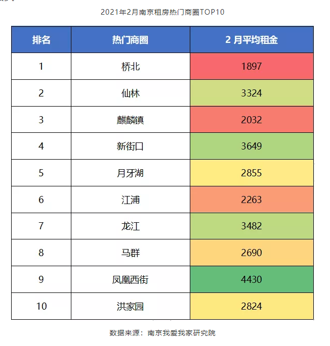 我爱我家南京研究院的2月租赁市场报告还指出,2月份南京租房的热门商圈和小区中,低租金、陪读是大部分商圈和小区的上榜原因。从热门商圈来看,桥北为南京租房热门商圈的“头牌”,2月平均租金仅为1897元,远远低于全市平均水平;此外,麒麟、江浦、马群同样因租金低廉而入榜。仙林、龙江、凤凰西街则是南京的“学区”重镇,陪读需求大,因而以“陪读租房”入榜。租房的热门小区同样如此,租金较低的小区租房热度最高,如四方新村2月平均租金为2368元排名第一,中南世纪雅苑2340元、万达茂中心1989元、锦绣花园1567元分别排在第二到第四位。
