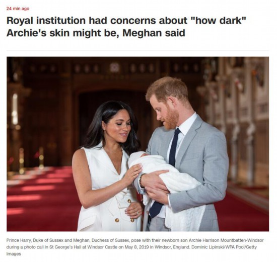报道称,当被奥普拉问及她为什么认为王室不想给阿尔奇一个正式头衔时,梅根透露,种族一直是王室的关注点,有一些“关于他(指小王子阿尔奇)出生时皮肤可能有多黑的担心和讨论。”