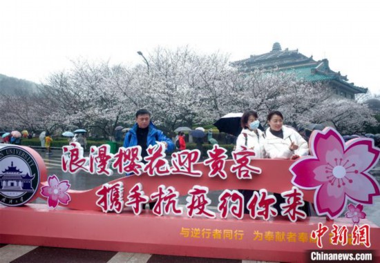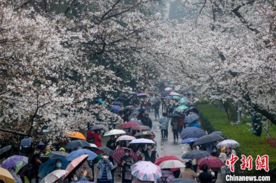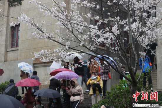 中新网武汉3月8日电 (记者 马芙蓉)8日是2021年武汉大学赏樱预约首日,尽管天公不作美,下起小雨,但是依然难以阻挡游客赏樱热情。