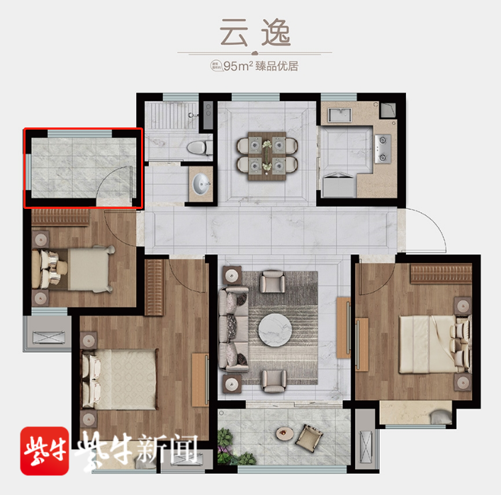 “95㎡是目前卖的比较火的,毛坯交付。”销售员说。但贺女士发现95㎡户型,有1个朝北的卧室,面积相对较小,便指着户型图询问销售人员。销售人员立即回答她,“这个朝北的房间连着一个小阳台,因为是毛坯交付,后期可以根据自己需求敲掉进行改造。”