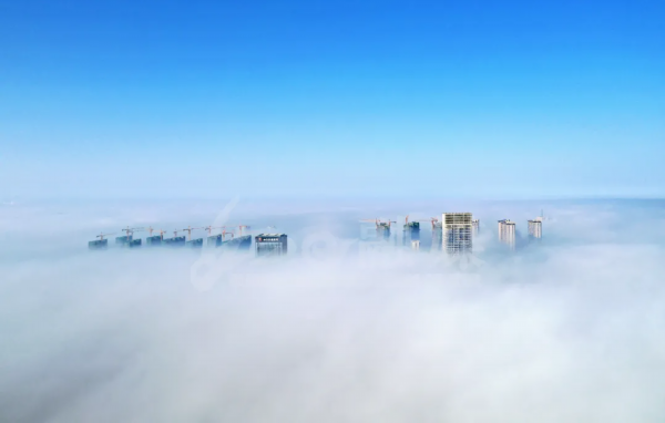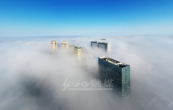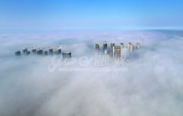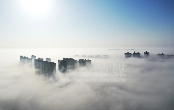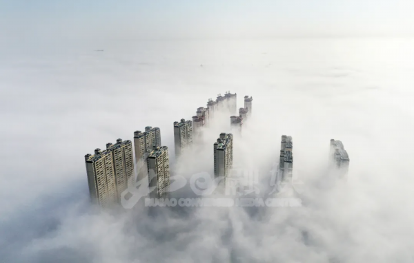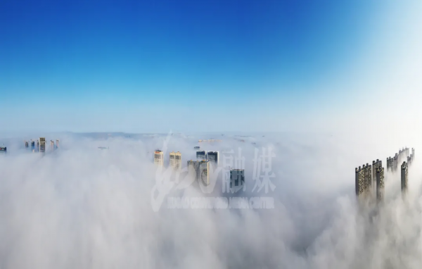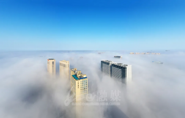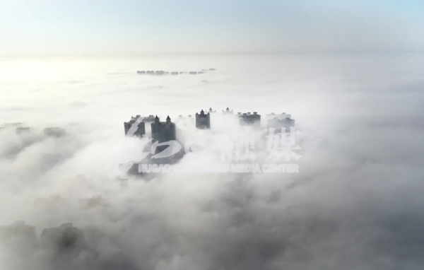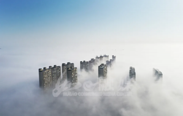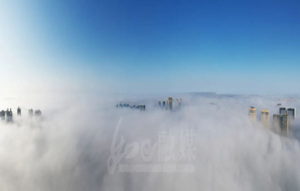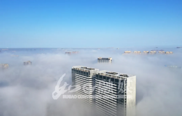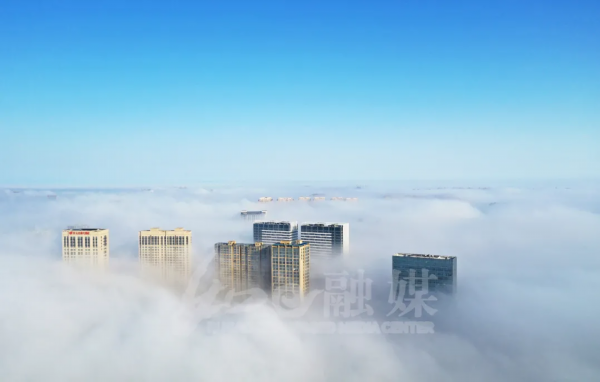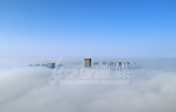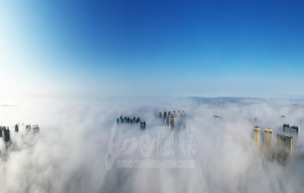 今天早晨,如皋市上空出现平流雾,建筑物矗立在虚无缥缈的云雾之间,犹如人间仙境,空中俯瞰十分壮观。