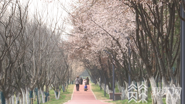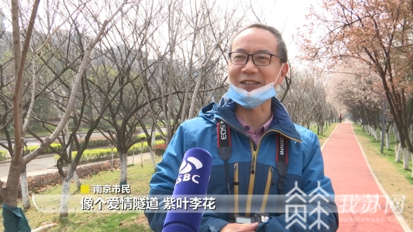 在南京花神大道绿道两侧,紫叶李开满了花,市民置身其中,仿佛在穿越“爱情隧道”,很是温馨浪漫。