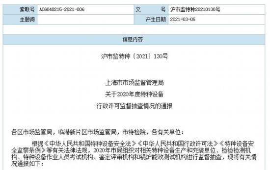 上海市市场监督管理局于近日公示的《关于2020年度特种设备行政许可监督抽查情况的通报》(沪市监特种〔2021〕130号)显示,此次监督抽查采用重点抽查与“双随机”抽查相结合的方式,结合投诉举报、日常监察、检验检测、鉴定评审、许可审批等工作中发现的问题和薄弱环节,上海市市场监督管理局对217家相关单位进行了监督抽查。其中,上海电气集团股份有限公司(“上海电气”,601727.SH)旗下公司遭通报批评。