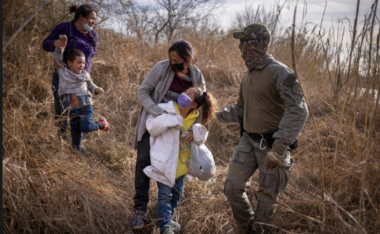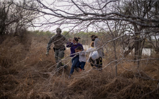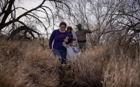 ……一名从头到脚穿着绿色衣服的得州警员,一只手紧握手铐,示意这个移民家庭从灌木丛中走出来。”