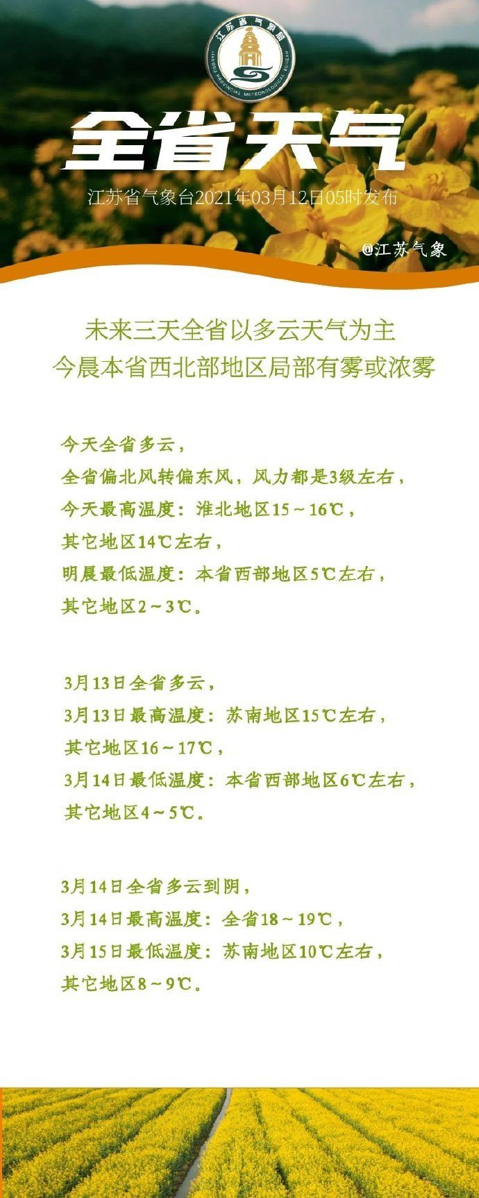 我苏网讯 今天全省多云,全省偏北风转偏东风,风力都是3级左右,今天最高温度:淮北地区15~16℃,其它地区14℃左右,明晨最低温度:本省西部地区5℃左右,其它地区2~3℃。