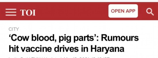 另一名写信给哈里亚纳政府的人对《印度时报》说:“打疫苗会毁了我们这个地区。它里面有牛肉和牛脂肪,这会伤害我们的宗教感情。”