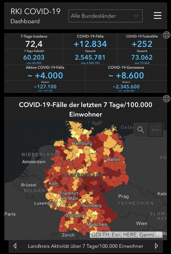 根据德国联邦疾控机构罗伯特·科赫研究所发布的最新数据,截至当地时间3月12日0时,德国累计确诊新冠肺炎病例2545781例,较前一日新增确诊12834例;累计死亡73062例,较前一日新增252例。