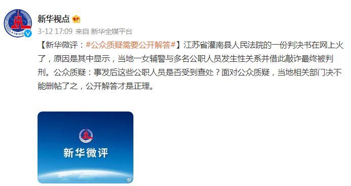江苏省灌南县人民法院的一份判决书在网上火了,原因是其中显示,当地一女辅警与多名公职人员发生性关系并借此敲诈最终被判刑。公众质疑:事发后这些公职人员是否受到查处?面对公众质疑,当地相关部门决不能删帖了之,公开解答才是正理。