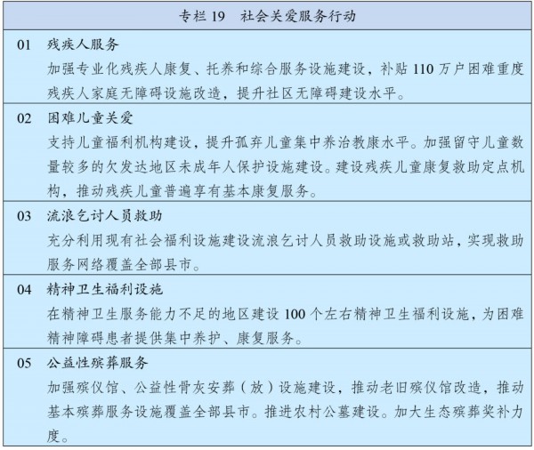 健全残疾人帮扶制度,帮助残疾人普遍参加基本医疗和基本养老保险,动态调整困难残疾人生活补贴和重度残疾人护理补贴标准。完善残疾人就业支持体系,加强残疾人劳动权益保障,优先为残疾人提供职业技能培训,扶持残疾人自主创业。推进适龄残疾儿童和少年教育全覆盖,提升特殊教育质量。建成康复大学,促进康复服务市场化发展,提高康复辅助器具适配率,提升康复服务质量。开展重度残疾人托养照护服务。加强残疾人服务设施和综合服务能力建设,完善无障碍环境建设和维护政策体系,支持困难残疾人家庭无障碍设施改造。