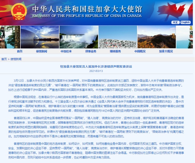 3月12日,加拿大外长伙同少数西方国家外长发表声明,对中国完善香港特区选举制度说三道四,诬称中国全国人大关于完善香港选举制度的决定“侵蚀香港选举制度的民主元素”,“破坏香港在‘一国两制’原则下的高度自治”。此前加外交部还发表推文,妄称中方有关举措“限制政治参与”。加方上述行径粗暴干涉中国内政,严重违反国际法和国际关系基本准则。中方表示强烈不满和坚决反对,已向加方提出严正交涉。