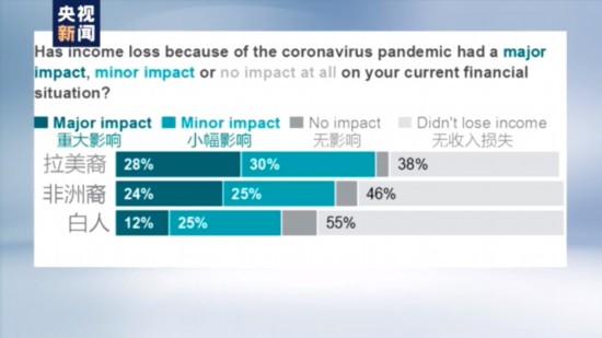 数据上看,在疫情期间,有62%的拉美裔和54%的非洲裔失去了某种形式的收入,包括失业、减薪、减少工时和无薪停职,而白人的这一比例为45%。