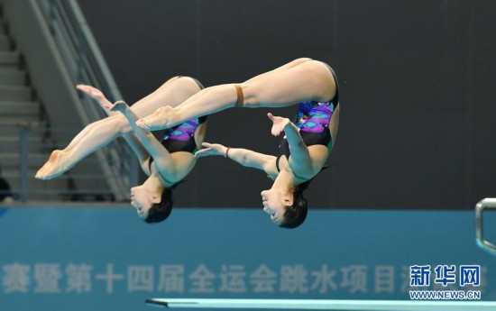 3月12日,王壹/贾东瑾(右)在比赛中。当日,2021年中国跳水明星赛暨第十四届全运会跳水测试赛在西安奥体中心游泳跳水馆开赛。在女子双人三米板决赛中,河北209队王涵/重庆队施廷懋组合以340.8分的总成绩夺得冠军,广东印海队陈艺文/湖北浩沙队昌雅妮组合与陕西浩沙队王壹/贾东瑾组合分别以320.82分和298.80分的总成绩获得亚、季军。新华社记者 张博文 摄