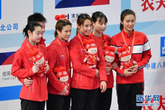 3月12日,冠军王涵(右三)/施廷懋(左三)、亚军陈艺文(左二)/昌雅妮(左一)和季军王壹(右二)/贾东瑾在女子三米板决赛颁奖仪式上。当日,2021年中国跳水明星赛暨第十四届全运会跳水测试赛在西安奥体中心游泳跳水馆开赛。在女子双人三米板决赛中,河北209队王涵/重庆队施廷懋组合以340.8分的总成绩夺得冠军,广东印海队陈艺文/湖北浩沙队昌雅妮组合与陕西浩沙队王壹/贾东瑾组合分别以320.82分和298.80分的总成绩获得亚、季军。新华社记者 张博文 摄