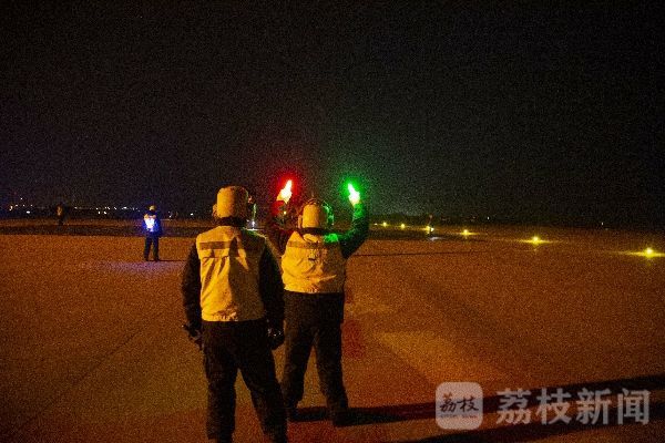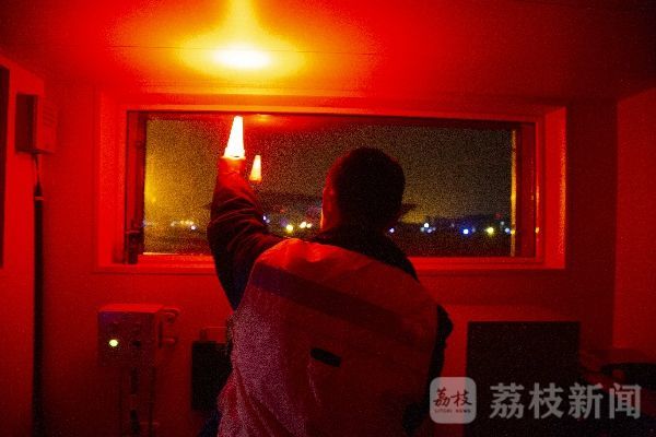 如果说昼间是一种检验,那么夜晚就是一场大考。受天气条件、暗夜的影响,舰面引导人员和飞行员、舰面引导人员之间的配合至关重要。他们利用手中的引导灯具作为信号,为“飞鲨”夜间起飞提供可靠帮助。