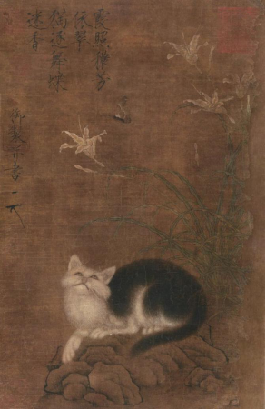 中国自古以农立国,种有五谷,而猫善捕鼠,有护粮之功且又驯良可爱,故受世人喜爱。猫作为题材入画由来已久,其实还有另一层寓意。“猫”谐音“耄”,猫蝶图也作耄耋图,有祈求长寿的吉祥寓意。俗语说狗来富,猫来贵。尤其宋代以养猫为贵,在宋徽宗及文人的书画中屡见不鲜。