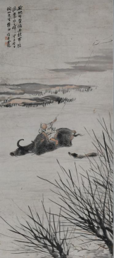 金健吾(1891—?),名余屯,祖籍盱眙,寓居扬州多年,又至上海,工绘画,善人物、花卉。画中描绘,旷野青山之间,一童子骑于牛背之上,一手持缰绳,一手高举,回首遥望,远处空中的纸鸢迎风飘荡。画中老牛四足沒于水中,正奋力渡河,后面一只小牛紧紧跟随。画面趣味十足,乡间风情跃然纸上。