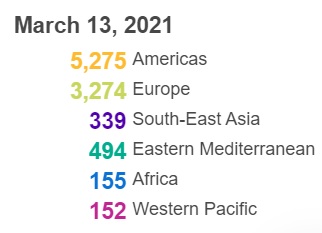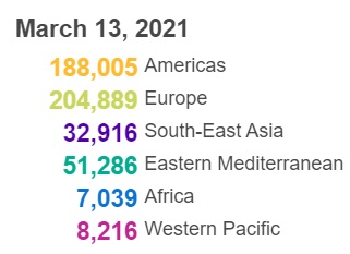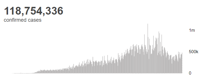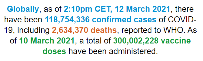 根据世卫组织最新实时统计数据,截至欧洲中部时间3月13日14时10分(北京时间3月13日21时10分),全球累计新冠肺炎确诊病例118754336例,累计死亡病例2634370例。3月13日全球新冠肺炎确诊病例新增492351例,死亡病例新增9689例。
