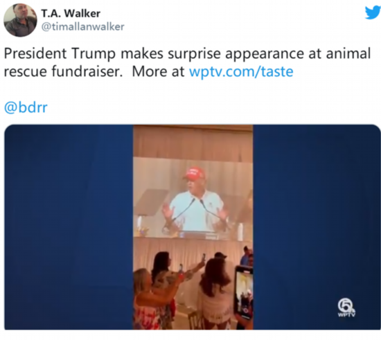 “商业内幕”援引当地媒体WPTV报道称,特朗普当天身穿便装,戴着写有“让美国再次伟大”(MAGA)的标志性红帽现身,走上舞台发表了简短讲话。关于此次筹款活动,他说:“(你们正在做的)事情非常重要,非常伟大,非常重要,我100%支持你们,你们曾在白宫和椭圆形办公室多次开会讨论过拯救和帮助狗狗。”