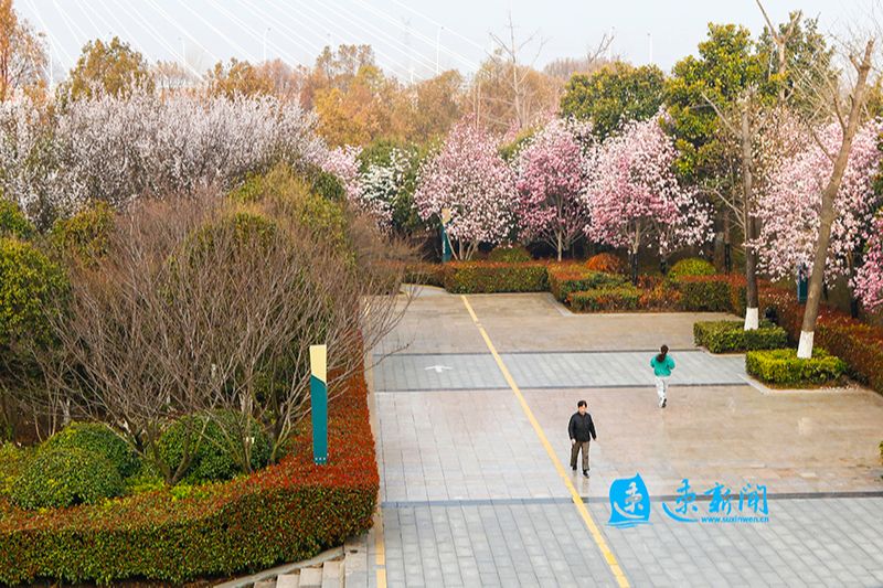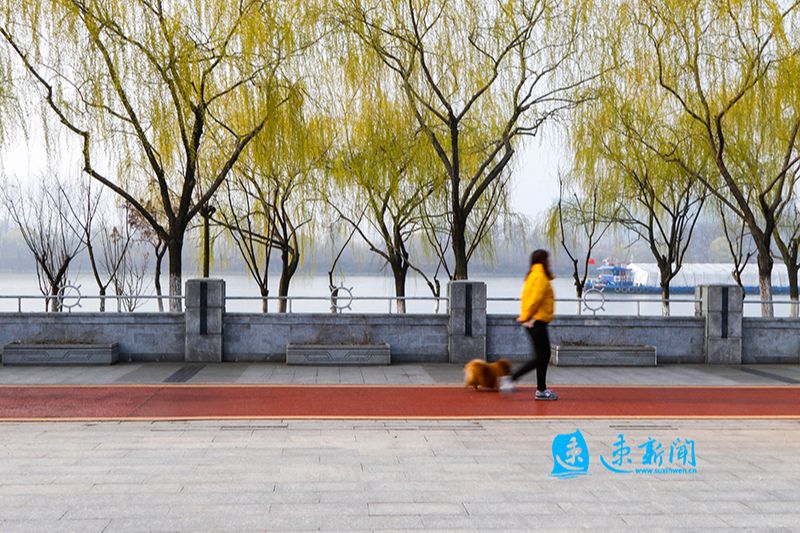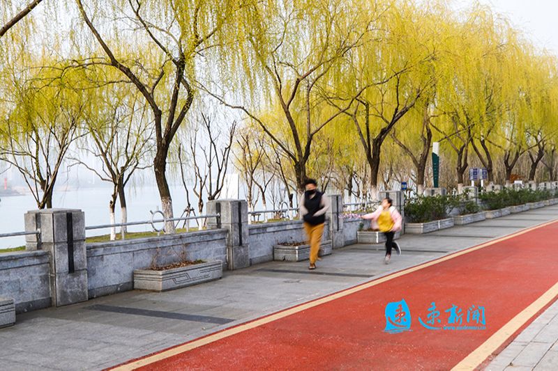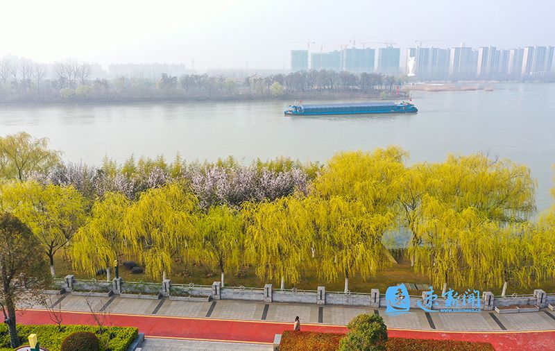 3月14日,宿迁市泗阳县京杭运河风光带垂柳依依、鸟语花香,市民在运河风光带沿线健身、观景,饱览春日风光。
