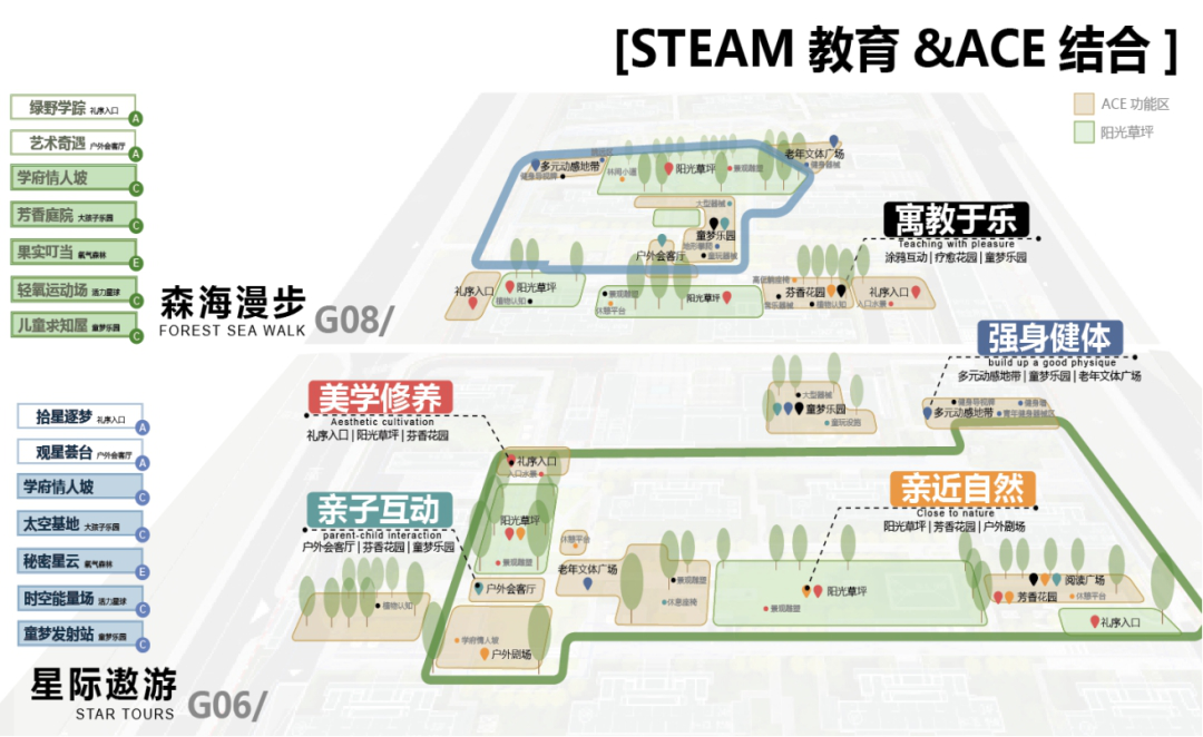 都会诚品项目景观以“健康+教育”为核心内容,以“学海上的艺术学府”为设计主题,植入STEAM教育理念,将尚院、岚院分别打造为艺术和科学主题。项目打造了“森林漫步”和“星际遨游”两大主题景观。同时综合考量场地动线,打造了“艺术美学类”、“社交游乐类”、“科普教育类”三大类景观。满足全龄层生活娱乐场景。
