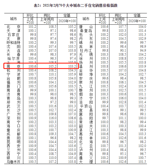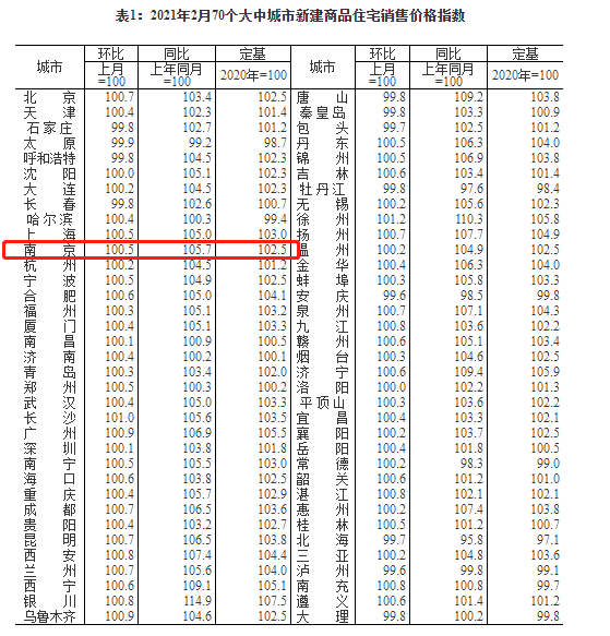 刚刚,国家统计局发布《2021年2月份70个大中城市商品住宅销售价格变动情况》。数据显示:2021年2月份,南京新房价格环比上涨0.5%,同比涨5.7%;二手房环比上涨0.6%,同比上涨5.2%。