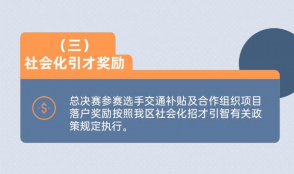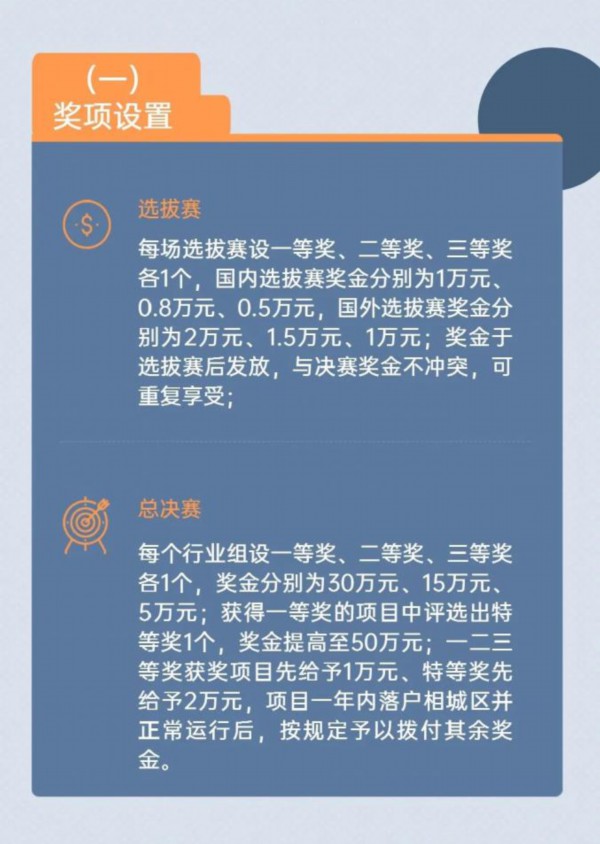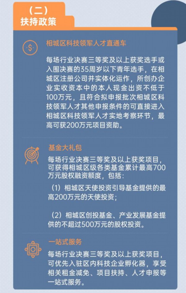 本届大赛进一步加强对参赛优质项目的资源加持和价值赋能,设置超300万的总奖金池,并对每场行业决赛三等奖及以上获奖选手或入围决赛的35周岁以下青年选手开通相城区科技领军人才直通车。同时,还推出最高700万元股权融资基金大礼包。落户后可优先享受租金减免、项目扶持、人才政策申报等一站式服务。
