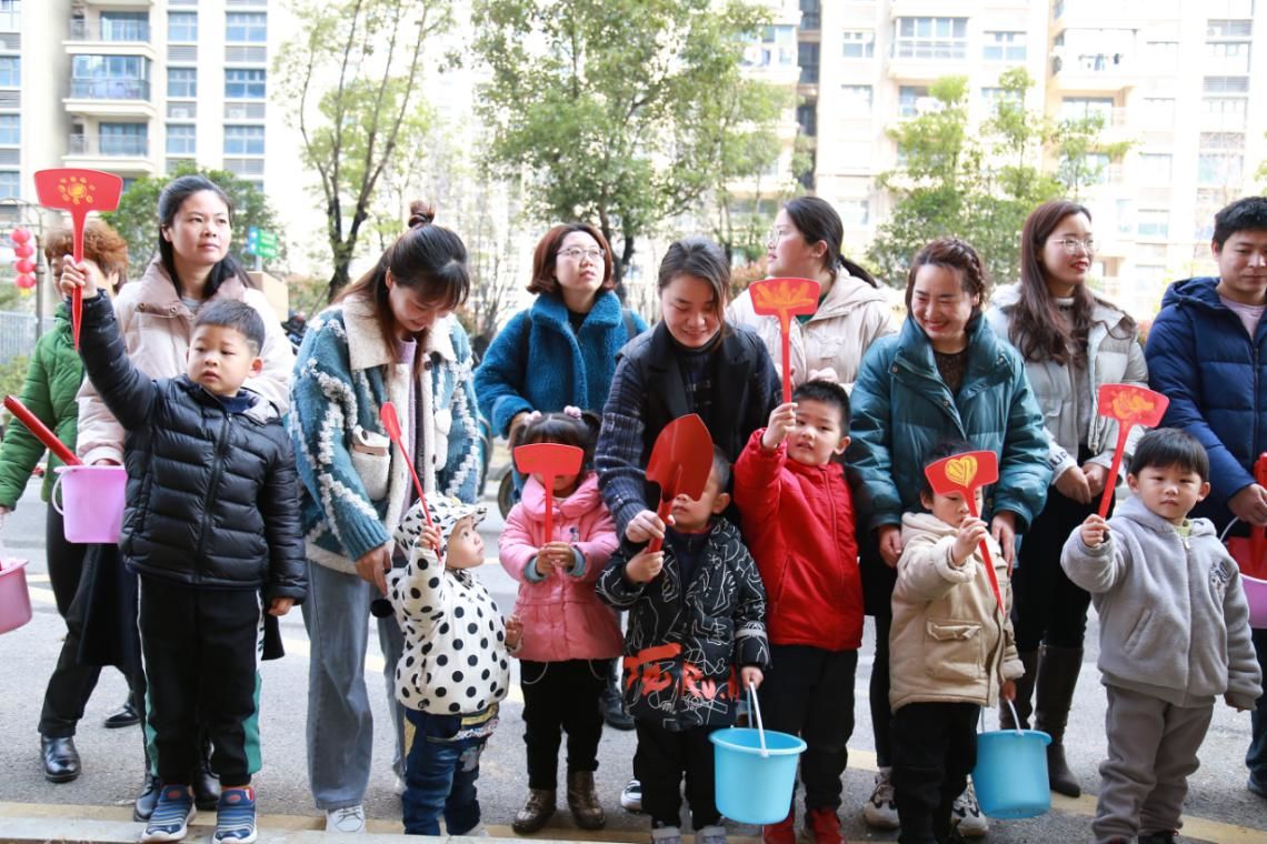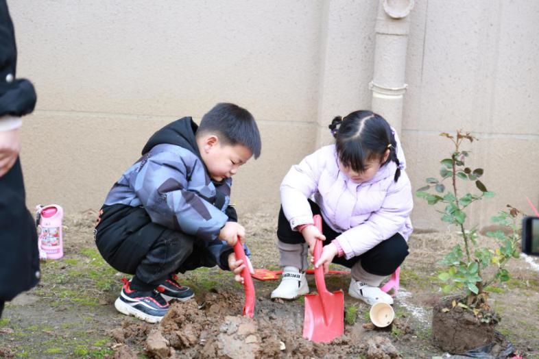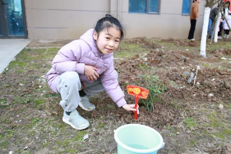 种植环节开始啦~孩子和家长们按照分工一起动手,挖坑植苗、挥锹铲土、灌溉浇水,忙得不亦乐乎。小小“园艺工程师”为自己亲手种的小树插上了属于自己的名片。