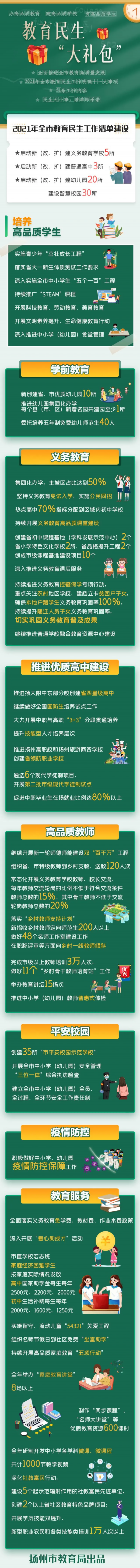 今天(3月15日),扬州市教育局发布“教育民生一号文件”:《关于推进教育民生工作的意见》(以下简称《意见》),就2021年全市教育民生工作明确十一大事项、51条工作内容。