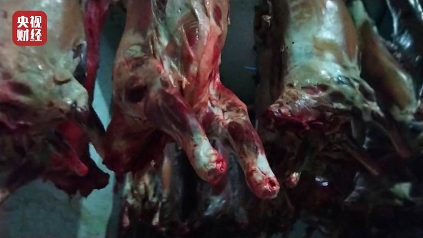 只见车内悬挂着一扇扇羊肉,这些羊腿明显瘦肉多,肉质坚硬,颜色发深。商贩表示,之所以不在市场内的商铺上销售,是因为这些羊肉无法通过检测。