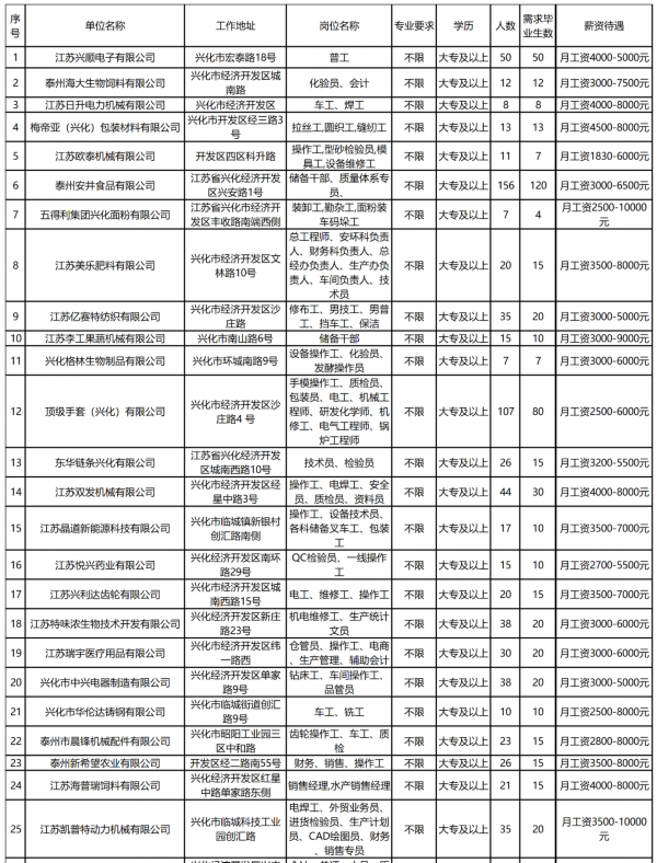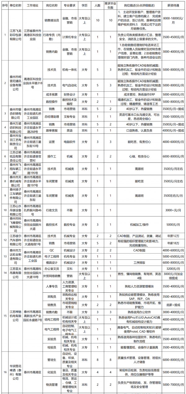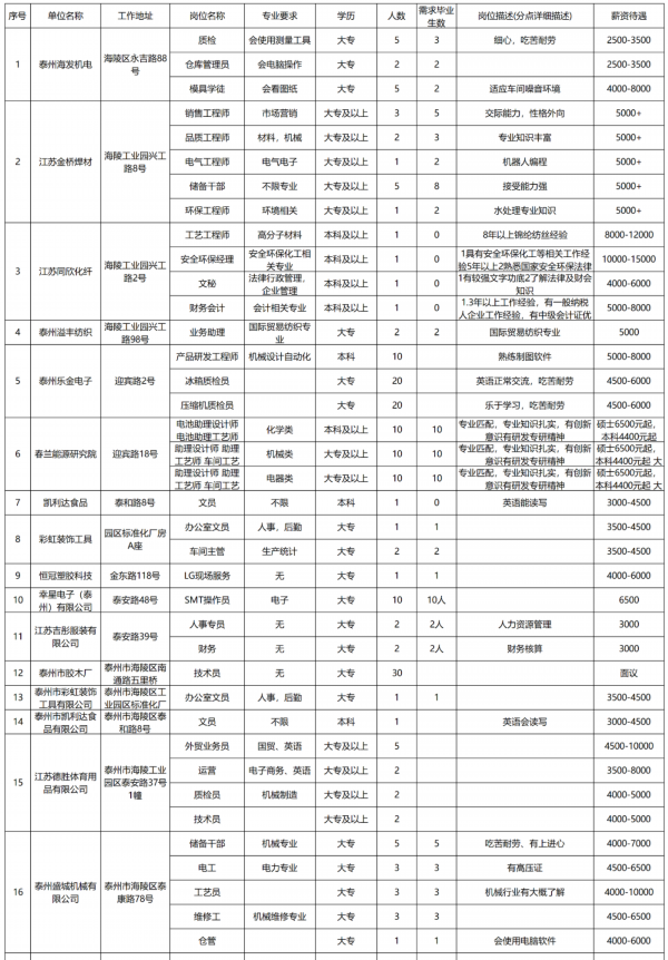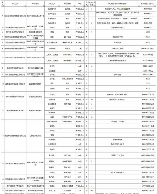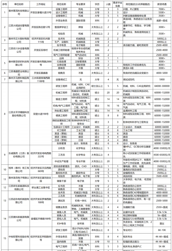 想找工作的伙伴们注意啦 !!! 泰州市人才服务中心现面向全市规上企业征集2021年上半年企业人才需求信息,本次共征集848家规上企业、2515个岗位、需求人数15690人,涵盖生物医药、化工、新材料金融、商贸等行业 。
