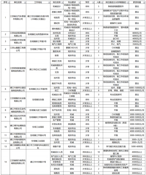企业:免费注册江苏省智慧就业云平台,可线上发布岗位。注册后企业通过平台自主预订周六现场招聘会