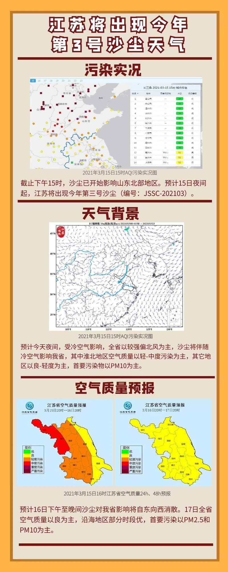 15日,江苏省环境监测中心与省气象台会商后表示,预计从15日夜间至17日凌晨,冷空气南下,江苏省受沙尘过程持续影响,沿江苏南城市PM10浓度将短时达轻度—中度污染水平,其他城市将短时达中度—重度污染水平。