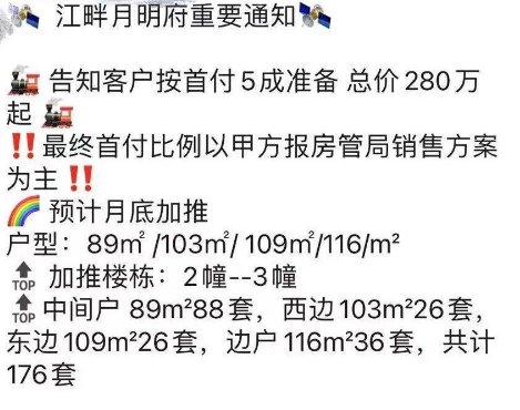 最新爆出打算提高首付的楼盘是江北研创园板块的江畔月明府,之前该楼盘的最低首付为3成,而在销售人员发布的最新消息中,要求客户“按照5成首付准备资金”,并强调“最终首付比例按房企的销售方案为准”。以该楼盘的89平方米户型为例,前期售价为30000元/㎡,首付3成约80万元,首付提至5成的话则需要134万,购房门槛直接提高了54万,对于刚需买家是个不小的考验。