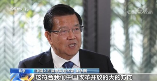 中国入世首席谈判代表 龙永图:宣布中国加入世界贸易组织的大会结束以后,我接受了中外记者的采访,当时我用了一个字来表达当时兴奋和自豪的心情——“爽”!确实经过那么多年的谈判,中国终于回到了世界经济的大舞台。回想多年的谈判,确实克服了很多的困难。其中,最艰难的谈判是和美国代表团进行的,美国代表团提出了很多的要求,但是归纳起来,无非就是两条, 一个是要我们中国遵守国际规则,第二要求我们中国开放市场。后来我们也想,遵守国际规则和开放市场符合我们改革开放大的方向,也符合中国和世界实现共赢的总的格局。