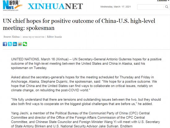 报道称,当被问及联合国秘书长古特雷斯对定于18日和19日在阿拉斯加州安克雷奇举行的中美高层战略对话有何期待时,古特雷斯的发言人斯蒂芬·杜贾里克(Stephane Dujarric)说:“我们希望(对话)取得积极成果。我们希望中美两国能够在关键议题上,特别是在气候变化、重建后疫情世界等问题上找到合作的途径。”