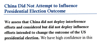 这份报告是美国情报机构2021年1月7日向总统、政府、国会提供的一份机密报告的解密版本。报告的目的是调查国外势力是否介入2020美国大选,调查得出了5项基本结论,矛头再次指向了俄罗斯、伊朗等国。报告认为,中国没有采取行动影响美国大选结果:“我们对这一判断有高度信心。” “中国寻求与美国关系的稳定,认为不论选举结果如何,都不值得中国冒干预大选的风险。中国方面认为,不管大选的胜出者是谁,传统的影响力工具已经足以影响中美关系。”