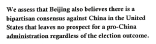 这份报告认为,“中国相信,无论两人谁当选美国总统都会给中国带来机遇和挑战。中国也认为美国两党在制华问题上有共识,无论选举结果如何,都不会出现亲华的政府。”