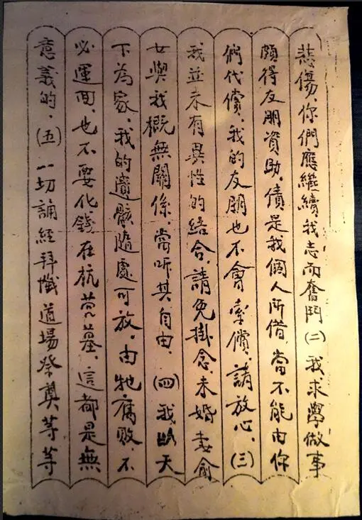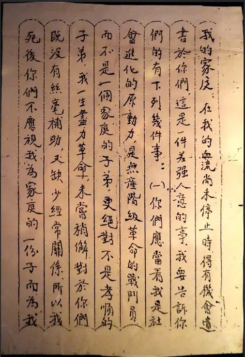 “我一生尽力革命,未尝稍懈,对于你们既没有丝毫补助,又缺少经常关系,所以我死后你们不应视我为家庭的一份子而为我悲伤,你们应继续我志而奋斗……”