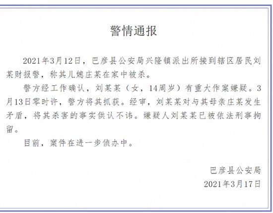 荔枝新闻讯 2021年3月12日,黑龙江巴彦县公安局兴隆镇派出所接到辖区居民刘某财报警,称其儿媳庄某在家中被杀。