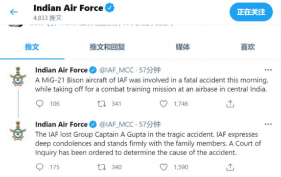 印度空军在社交媒体上证实这一消息,称一架米格-21战斗机今天上午在印度中部一个空军基地执行战斗训练任务时坠毁,一名空军上校(Group Captain)丧生,空军已下令一个调查法庭对事故原因展开调查。