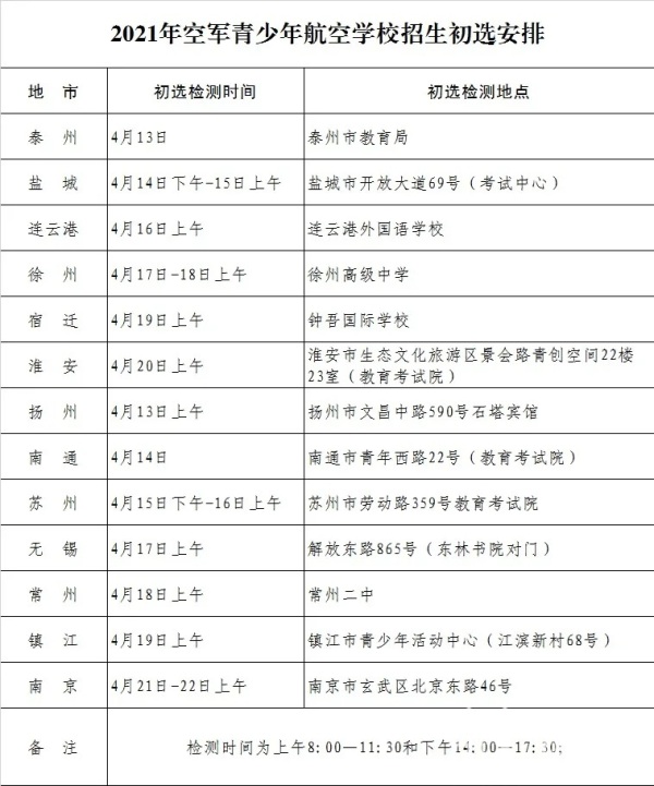 1.初选(2021年4月12日-21日)。南京选拔中心将派出初选检测工作组在各设区市设初选站,对符合报名条件的学生进行眼科、耳鼻喉科、外科等项目的检测,初选合格者于5月9日(初定)参加文化测评,考试科目为数学物理综合和语文英语综合。